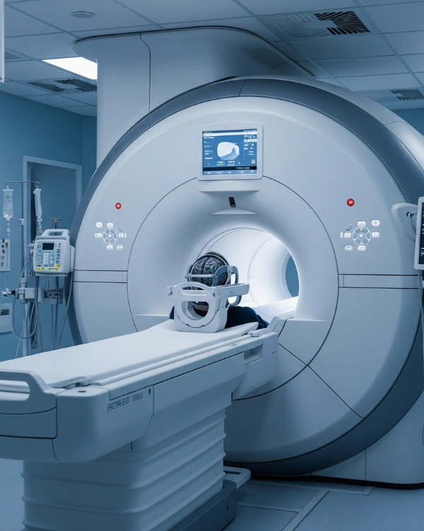 MRI (Magnetic Resonance Imaging) uses powerful magnets and radiofrequency waves — with no radiation — to create high-resolution images of the brain.