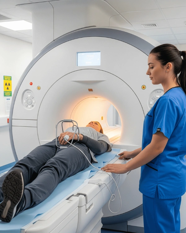 MRI (Magnetic Resonance Imaging) is a non-invasive technique that uses powerful magnetic fields and radio waves to produce clear, cross-sectional images of internal structures — without radiation.