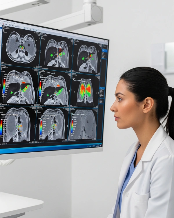 MRI uses powerful magnetic fields and radio waves to create cross-sectional images of the liver — without any exposure to radiation. A liver MRI provides: