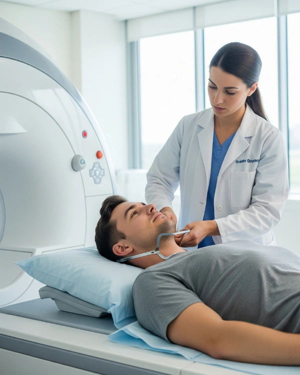 MRI (Magnetic Resonance Imaging) uses magnetic fields and radiofrequency waves — without radiation — to generate high-resolution cross-sectional images of the neck region.