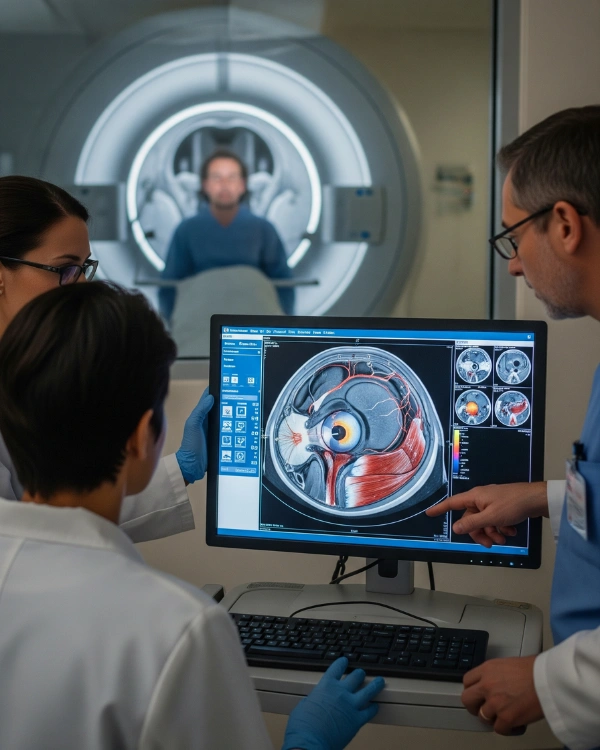 An MRI of the orbits provides high-resolution images of the eyeballs, optic nerves, extraocular muscles, lacrimal glands, and surrounding orbital tissues. It’s essential for diagnosing the cause of vision loss, double vision, eye pain, proptosis (bulging eye), or orbital tumors and infections.