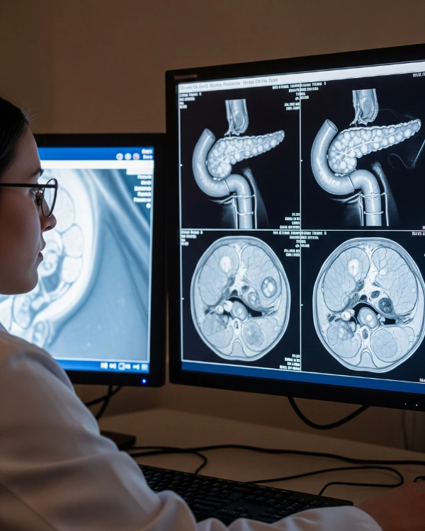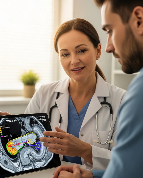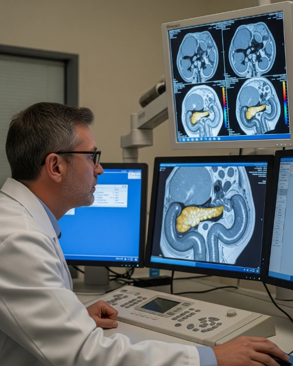 An MRI pancreas scan uses advanced imaging sequences, sometimes paired with MRCP (Magnetic Resonance Cholangiopancreatography), to visualise: