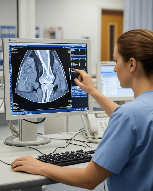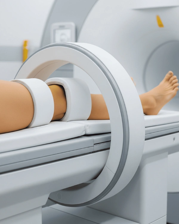 MRI (Magnetic Resonance Imaging) uses magnetic fields and radiofrequency waves — with no radiation — to provide clear, detailed images of internal leg structures.