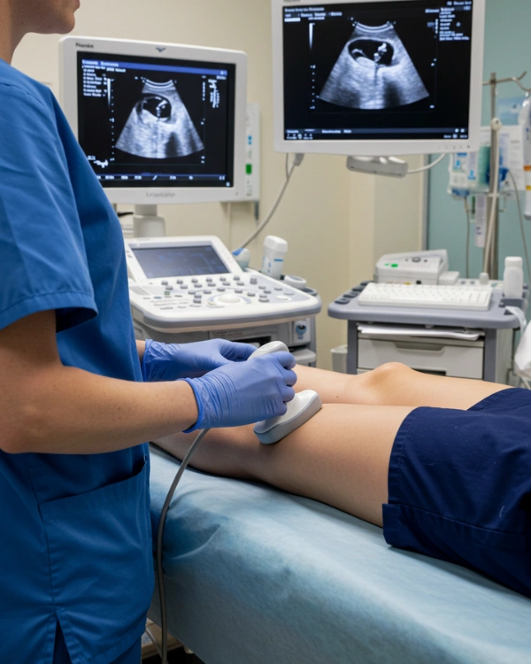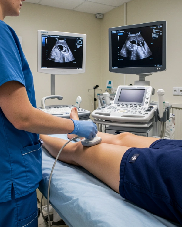 A lower limb venous Doppler ultrasound is a specialised scan used to assess blood flow in the deep veins of the legs, helping diagnose or rule out deep vein thrombosis (DVT). It is a vital test in patients presenting with leg pain, swelling, redness, or immobility.