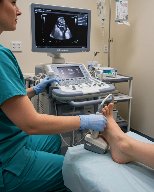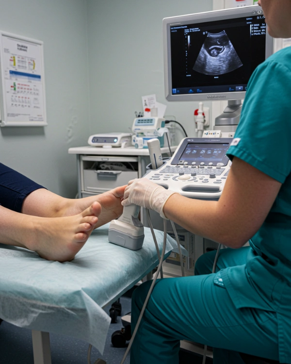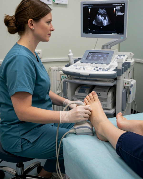An ultrasound of the foot is a focused, radiation-free scan used to evaluate ligaments, tendons, plantar fascia, joints, and soft tissue structures of the foot. It is ideal for identifying causes of heel pain, swelling, soft tissue injury, and post-traumatic complications.